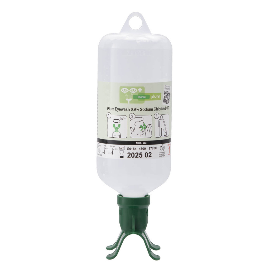 A flakon 1,0 liter 0,9%-os steril nátrium-klorid oldatot tartalmaz. A Plum elsősegély szemkimosó alkalmas idegen testek, szennyeződések (például por, piszok, fém és fa szilánkok, stb), sőt egyes vegyszerek, például olajok és oldószerek öblítéséhez is. A DUO kialakítás lehetővé teszi a két szem egyidejű öblítését. Könnyen kezelhető flakonban, ergonomikus kupakkal, porvédővel és egyértelmű használati utasítással van ellátva. Önálló használatra, vagy falra szerelhető állomások feltöltéséhez is alkalmas. 1000 ml-es kiszerelésének köszönhetően hosszabb öblítési időt biztosít. Szavatossági idő: 3.5 év. Öblítési idő: kb 5 perc.