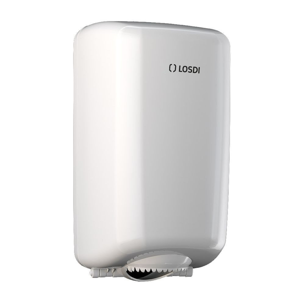 Losdi tekercses kéztörlő adagoló, ABS műanyagból. Fehér színben. 14 cm átmérőjű belsőmagos kéztörlőkhöz.