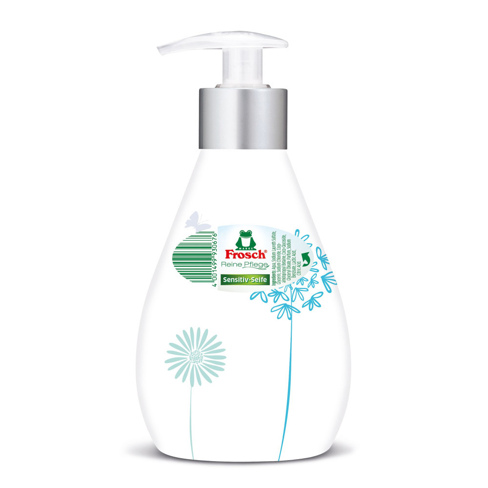 Frosch pumpás folyékony szappan érzékeny bőrre 300 ml-es kiszerelésben, praktikus pumpás adagolófejjel. Sensitive, nyugtató formulájával kíméletesen tisztítja és védi a bőrt. Értékes, hidratáló összetevői támogatják a kézbőr természetes védőrétegét és kellemes, tiszta és puha érzetet biztosítanak. Bőrsemleges pH értékű, bőrgyógyászok által tesztelt, mikroműanyag mentes termék.