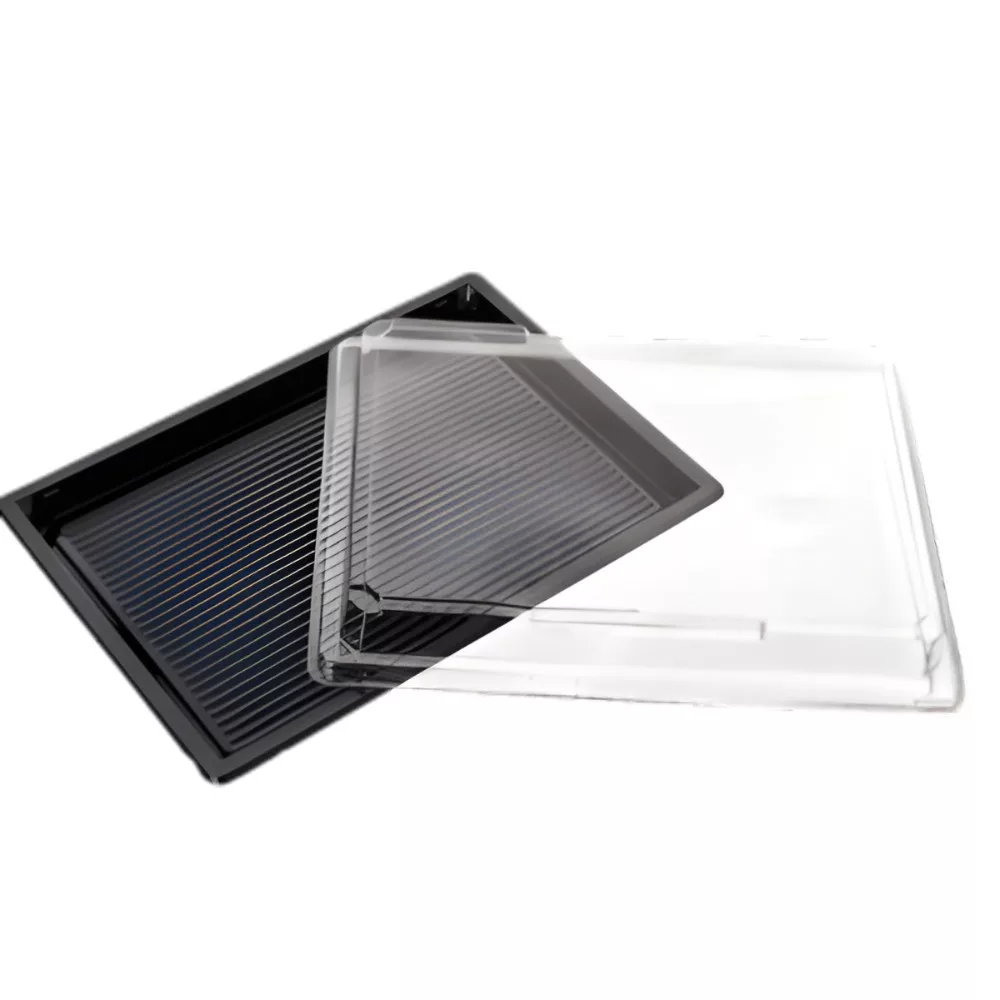 Ez a fekete aljú, kristálytiszta tetővel ellátott sushi doboz tökéletes megoldást kínál éttermek, sushi bárok és catering szolgáltatók számára. A polisztirol (PS) anyagból készült tálca elegáns hátteret biztosít az ételeknek, kiemelve azok frissességét és színeit, míg a páramentes, szorosan záródó tető garantálja a biztonságos, szivárgásmentes szállítást. Ideális választás sushi, maki, nigiri és egyéb hidegkonyhai finomságok csomagolására.