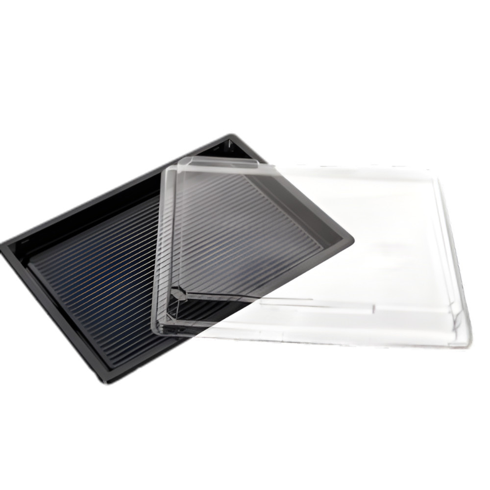 Emeld a sushi elvitel élményét egy új szintre ezzel az elegáns, fekete aljú és kristálytiszta tetővel ellátott sushi tálcával! Kifejezetten éttermek, sushi bárok és ételkiszállítással foglalkozó vállalkozások számára tervezték, hogy a japán ételek ne csak finomak, de látványosak is legyenek. A fekete tálca gyönyörűen kiemeli a sushi és a maki élénk színeit, növelve a vásárlói élményt.