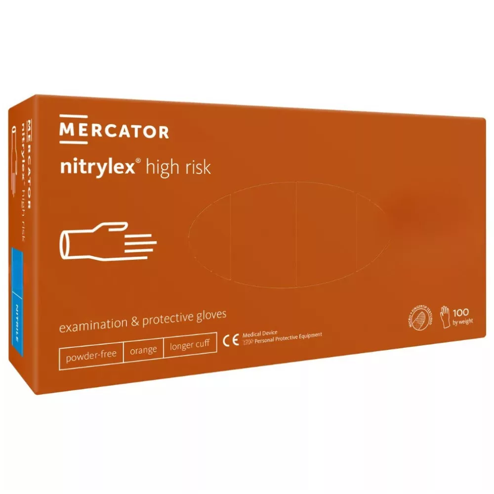 A Mercator nitrylex® high risk kesztyűt kifejezetten a magas kockázatú munkakörnyezetek kihívásaira tervezték. A hagyományos vizsgálókesztyűknél vastagabb nitril anyag és a meghosszabbított, legalább 27 cm-es mandzsetta kiemelkedő védelmet nyújt a vegyszerekkel, vírusokkal, baktériumokkal és gombákkal szemben. Élénk narancssárga színe kiváló láthatóságot biztosít, növelve a munkavégzés biztonságát.