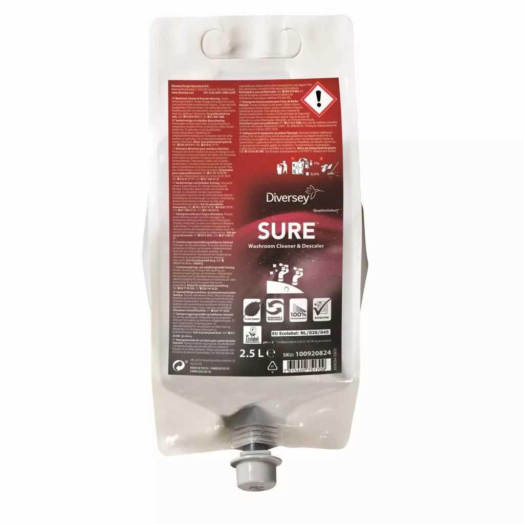 A SURE Washroom Cleaner & Descaler része a növényi alapú, 100%-ban biológiailag lebomló professzionális tisztítószerek egyedülálló termékcsaládjának minden napi tisztítási igényhez. Koncentrált, rendkívül hatékony termék mosdók és WC-k vízálló kemény felületeinek napi és időszakos tisztítására. Alkalmas bármilyen víztípushoz, beleértve a kemény vizű területeket is. A speciális összetétel kiváló tisztítási teljesítményt biztosít, miközben megakadályozza a vízkő lerakódását.