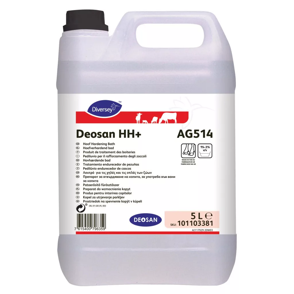 A Deosan HH+ egy vízben jól oldódó, savas kémhatású, réz-nitrátot tartalmazó lábvégfürösztő készítmény, amely erősíti és regenerálja a lábvégeket úgy, hogy keményíti a patákat miközben a szaru rugalmassága megmarad.