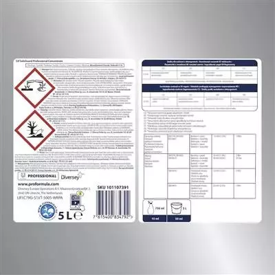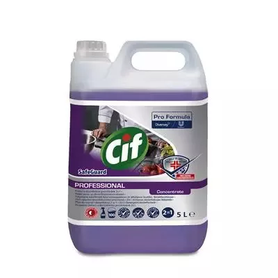 A Cif Pro Formula SafeGuard 2 az 1-ben Cleaner Disinfectant egy erősen koncentrált tisztító- és fertőtlenítőszer minden kemény felület egy lépésben történő tisztítására és fertőtlenítésére, beleértve az élelmiszerrel érintkező felületeket is. Nagyon hatékony a mikroorganizmusok széles köre ellen. Minden vízkeménység esetén ajánlott. Hatékonyan eltávolítja a zsíros és a rászáradt élelmiszer-szennyeződéseket.