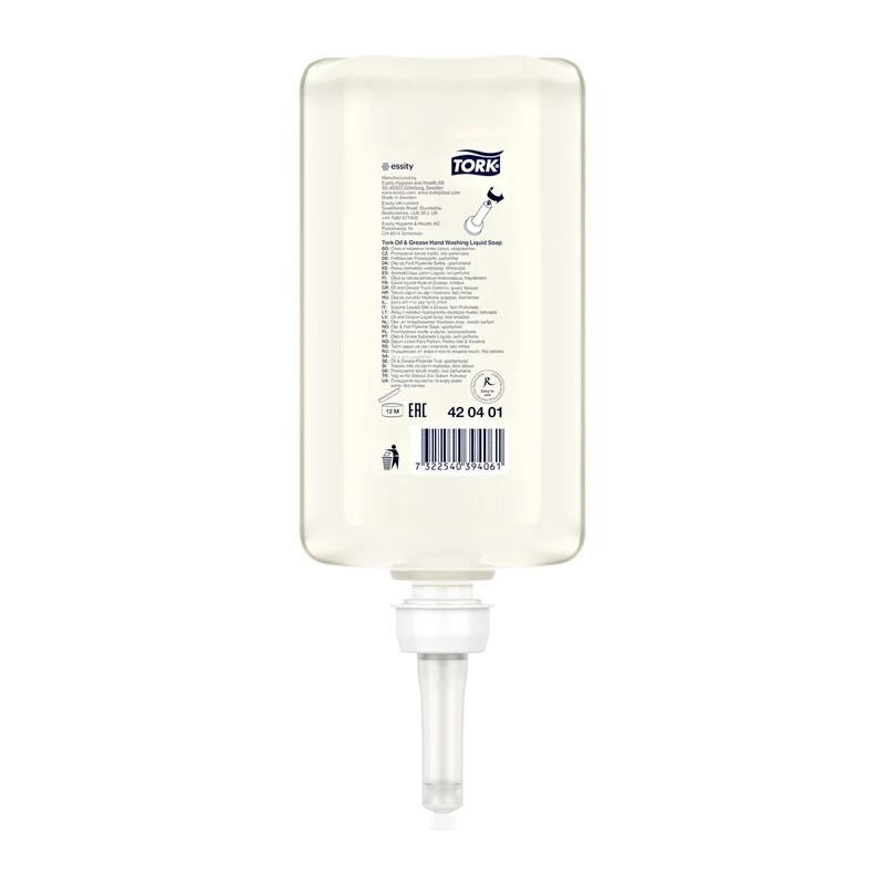 A szennyeződések, olajok és zsiradékok eltávolítására szolgáló Tork olaj- és zsíroldó folyékony szappan hatásos összetevőket tartalmaz, mégis kíméli a bőrt.