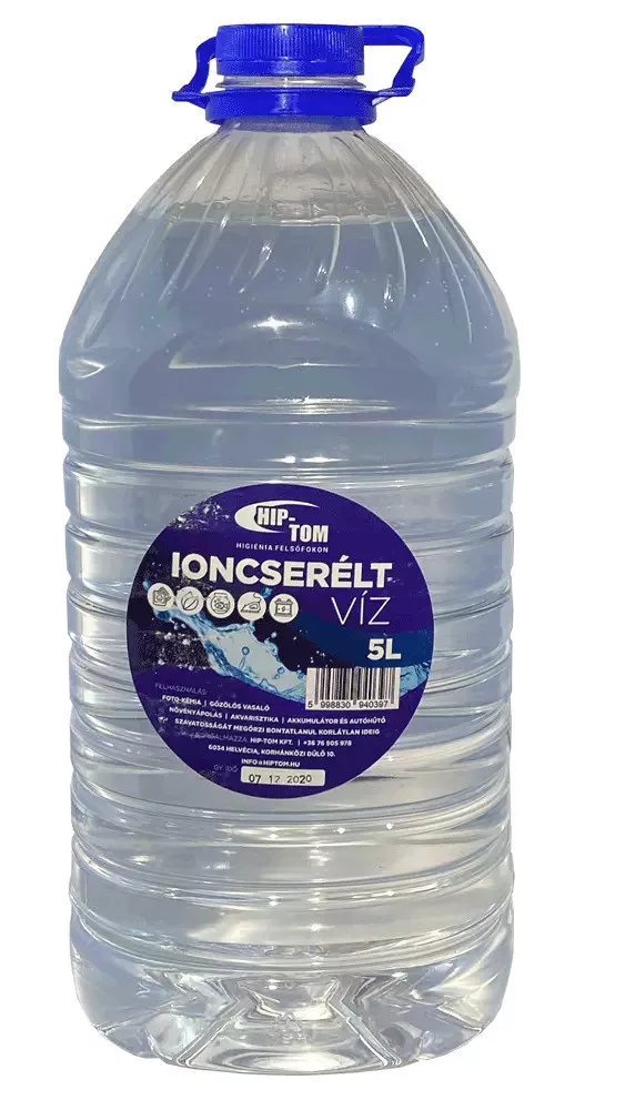 Hip-Tom ioncserélt víz, 5 literes kiszerelésben, 120 kanna/raklap mennyiségben. Tiszta, ionmentes víz, mely hatékonyan alkalmazható autók szélvédőmosó- és hűtőfolyadékának hígításához, savas ólomakkumulátorok és háztartási gépek utántöltéséhez.