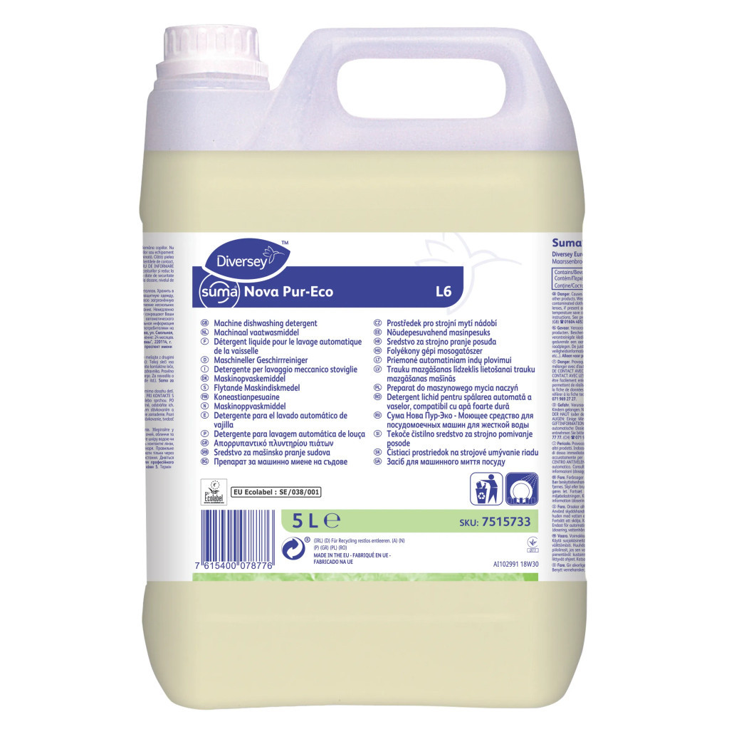 A Suma Nova Pur-Eco L6 egy koncentrált folyékony gépi mosogatószer, amely kiválóan eltávolítja a szennyeződést kemény víz estén is.