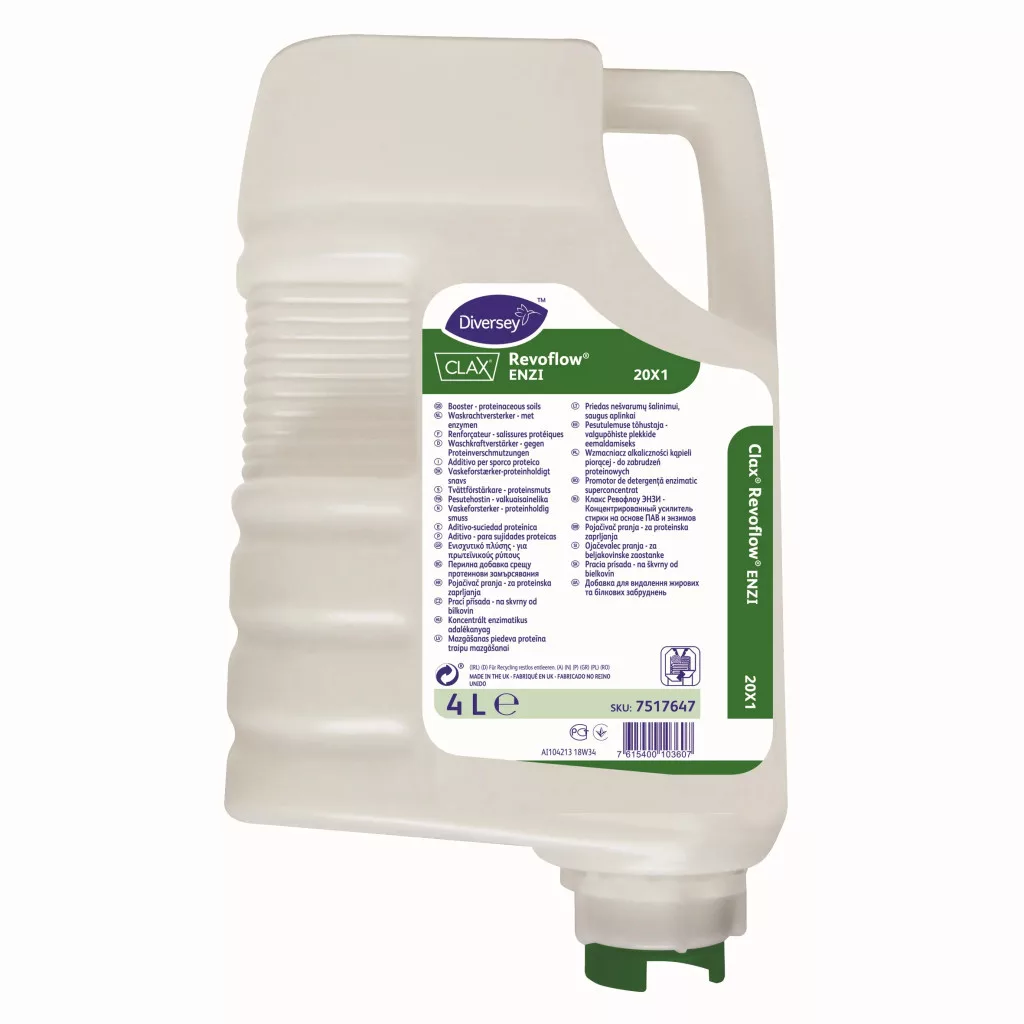 - A Clax Revoflow ENZI magas koncentrációjú felületaktív anyag/enzimműködést fokozó szer, amely nagy hatású felületaktív anyagokat és enzimeket tartalmaz. A felületaktív anyagok mind magas, mind alacsony hőfokon kiválóan oldják a zsírt, az enzimek pedig közepes hőfokon eltávolítják a fehérjefoltokat. A termék a többi Clax Revoflow termékkel együtt használandó, a mosás hatékonyságával kapcsolatos problémák esetén. Amennyiben zsír- és/vagy fehérjefolt eltávolítása a cél, a termék használata ideális nem túl magas hőfokon történő mosásnál. A Clax Revoflow ENZI kifejezetten alkalmas gyapjú és más kényes anyagok főmosására.