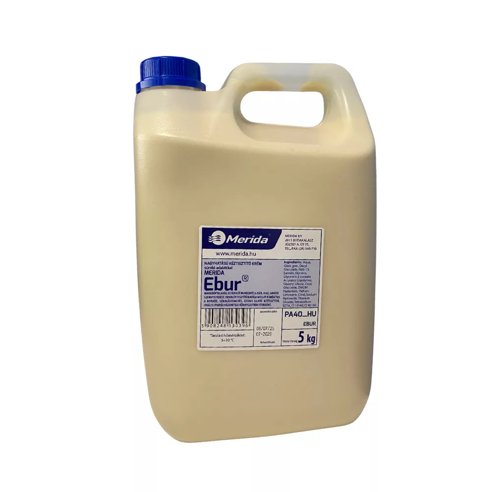 A Merida Ebur kéztisztító krém prémium minőségű, súrolószemcsékkel gazdagított tisztítószer, amely maradéktalanul eltávolítja a makacs zsír-, olaj- és grafitszennyeződéseket anélkül, hogy károsítaná a bőrt. Citrus illatú összetétele friss érzést biztosít használata után, miközben bőrvédő lanolinnal ápolja a kézbőrt. A masszív 5 literes kiszerelés költséghatékony megoldást kínál nagy forgalmú műhelyek, garázsok és ipari környezetek számára. A krém nem okoz dugulást a csatornarendszerben, és gond nélkül használható PA1 pumpás vagy PA2 fém tartós adagolókkal.