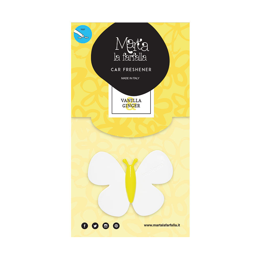 Marta la Farfalla kínálatában megtalálható a kiváló minőségű autóillatosító, melynek illata a vanília és a gyömbér különleges kombinációját hordozza.