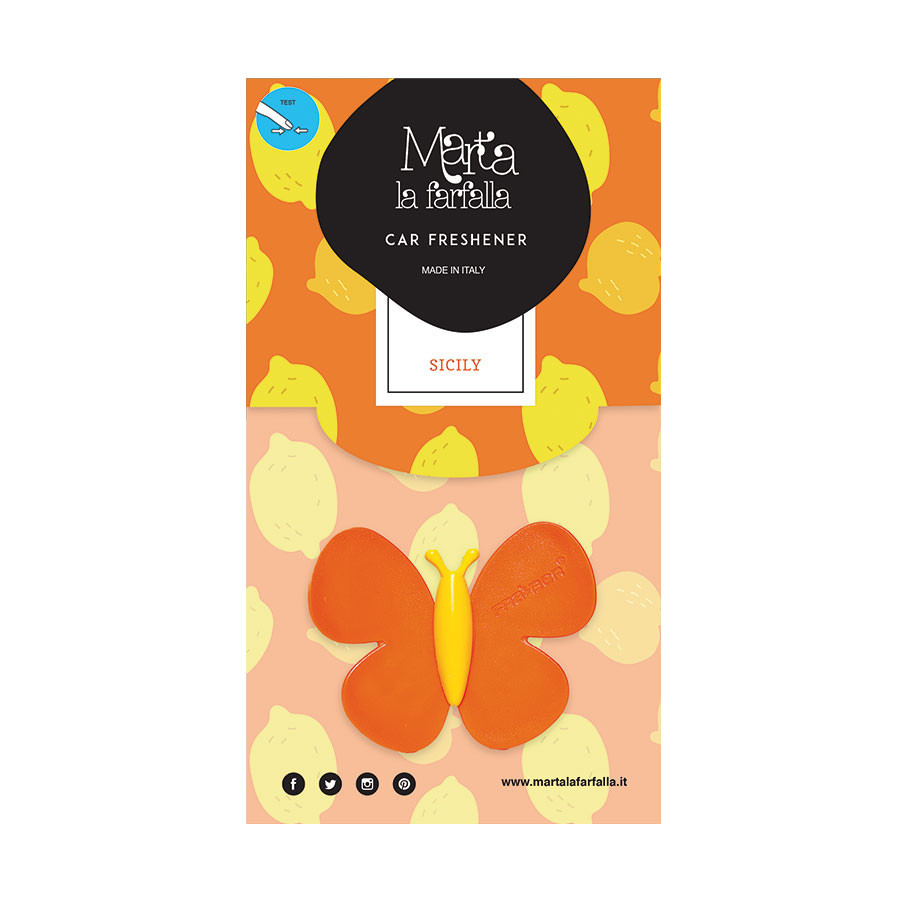 A Marta la Farfalla autóillatosító egy exkluzív termék, melynek illata az olaszországi Sicily szigetének friss és életteli illatvilágát idézi fel. A termék 12 darabos kiszerelésben érkezik karton dobozban.
