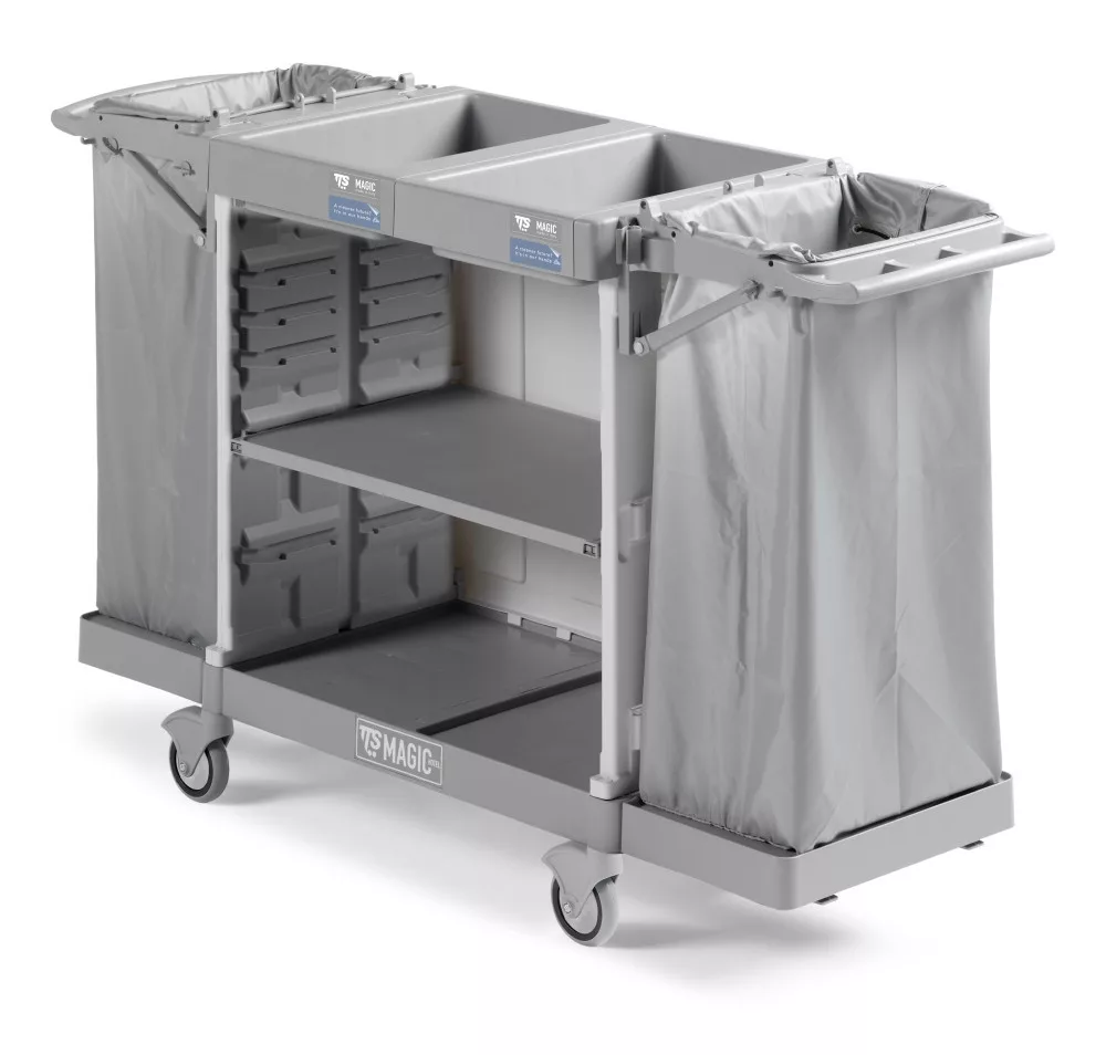 A TTS Szobalánykocsi Magic Hotel 890B egy alapváltozatú hotelkocsi, amely rendelkezik hátsó panelekkel és összecsukható tárolóval. Ez a többcélú polipropilén kocsi moduláris és testreszabható, hogy minden takarítási igényt kielégítsen.