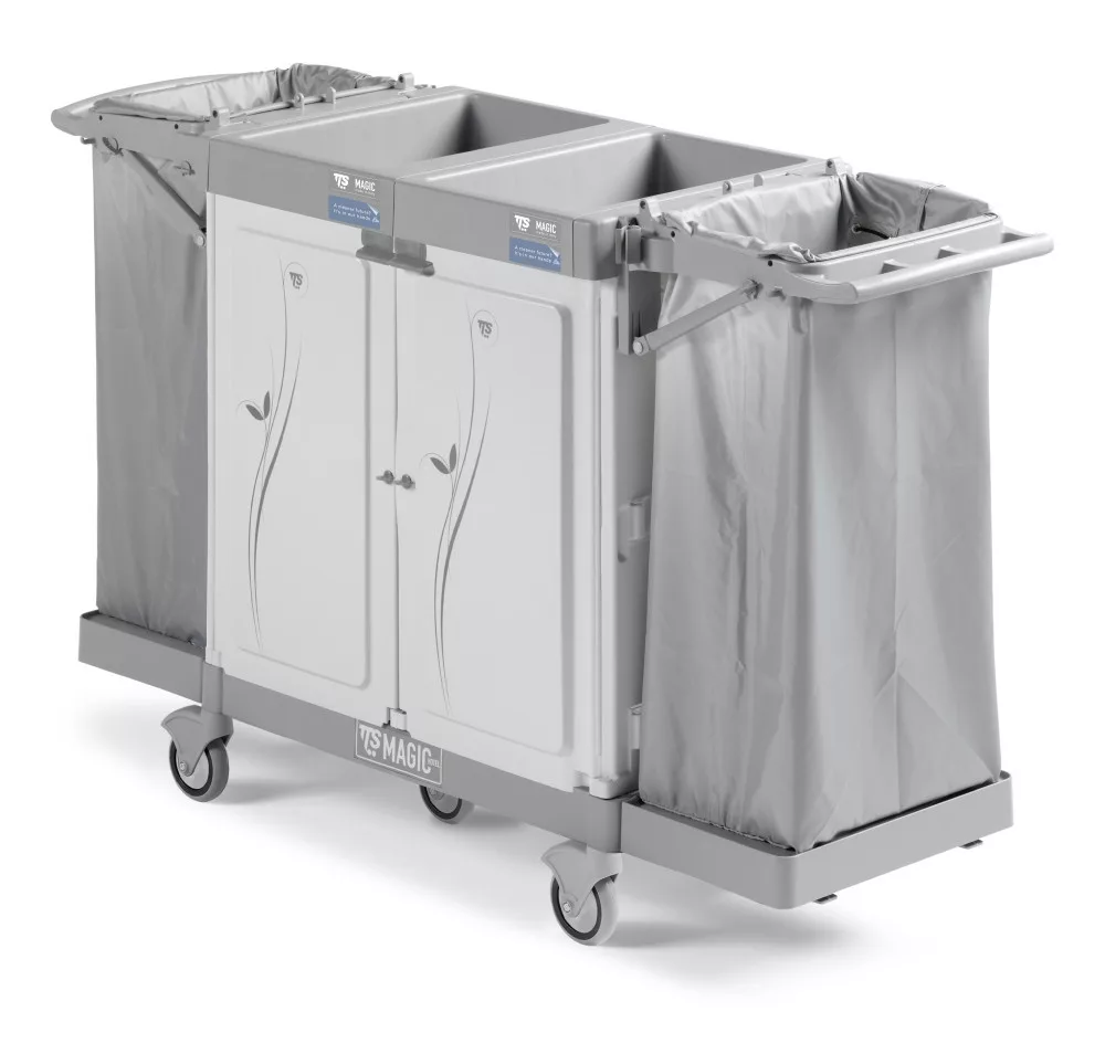 A TTS Szobalánykocsi Magic Hotel 890S egy zárt tárolóterülettel rendelkező, biztonságos verziójú szállodai kocsi. Ideális a takarítási műveletek megkönnyítéséhez.