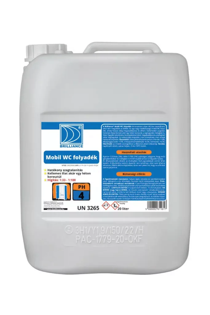 Brilliance® Mobil WC folyadék 1 literA Brilliance® Mobil WC folyadék kimondottan olyan WC-kben használható, ahol nem megoldott az öblítés. Ez egy nagy hatékonyságú fertőtlenítőszer, amely hosszú ideig megakadályozza a szerves anyagok bomlását, és elfedi azok kellemetlen szagát. Kellemes illatot biztosít akár egy héten keresztül, a legnagyobb melegben is. Télen fagyálló készítmény hozzáadásával lehet megakadályozni a behígított oldat megfagyását. Ez sokkal jobb megoldás, mint a konyhasó, mert annak hatása bizonytalan.