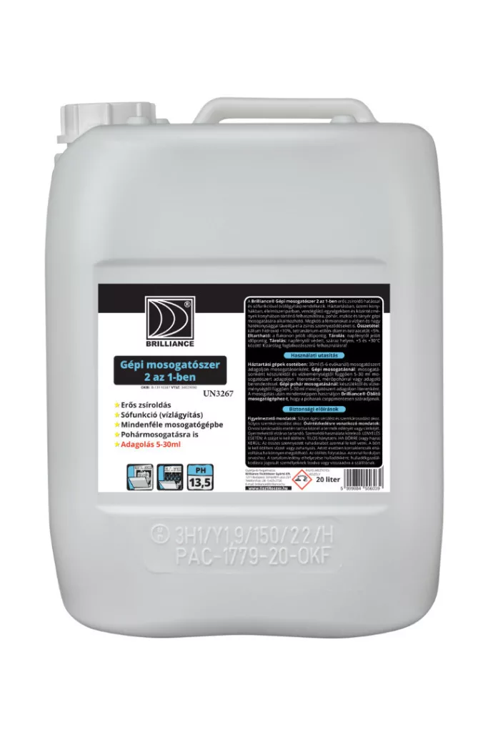 A Brilliance® Gépi mosogatószer 2 az 1-ben erős zsíroldó hatással és só funkcióval (vízlágyítás) rendelkezik. Háztartásban, üzemi konyhákban, élelmiszeriparban, vendéglátó egységekben és közintézmények konyháiban történő felhasználásra, pohár, eszköz és tányér gépi mosogatására alkalmazható. Megköti a fémionokat a vízben és nagy hatékonysággal távolítja el a zsíros szennyeződéseket is.