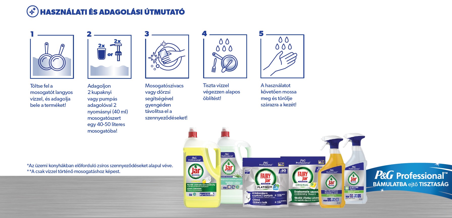 A Jar Professional Platinum kézi mosogatószer a Jar termékcsalád legjobb összetételű mosogatószere, amely zsíreltávolító felületaktív anyagokat tartalmaz. Minden típusú edény mosogatására alkalmas, a rozsdamentes acéltól a porcelánig. Hatékonyan távolítja el a zsír- és ételmaradványokat, a megszáradt és rásütött ételmaradékokat a fazekakról, serpenyőkről, evőeszközökről, tányérokról és egyéb konyhai eszközökről még hideg vízben történő mosogatás esetén is. Az edények mosogatás után tökéletesen tiszták és ragyogóak.