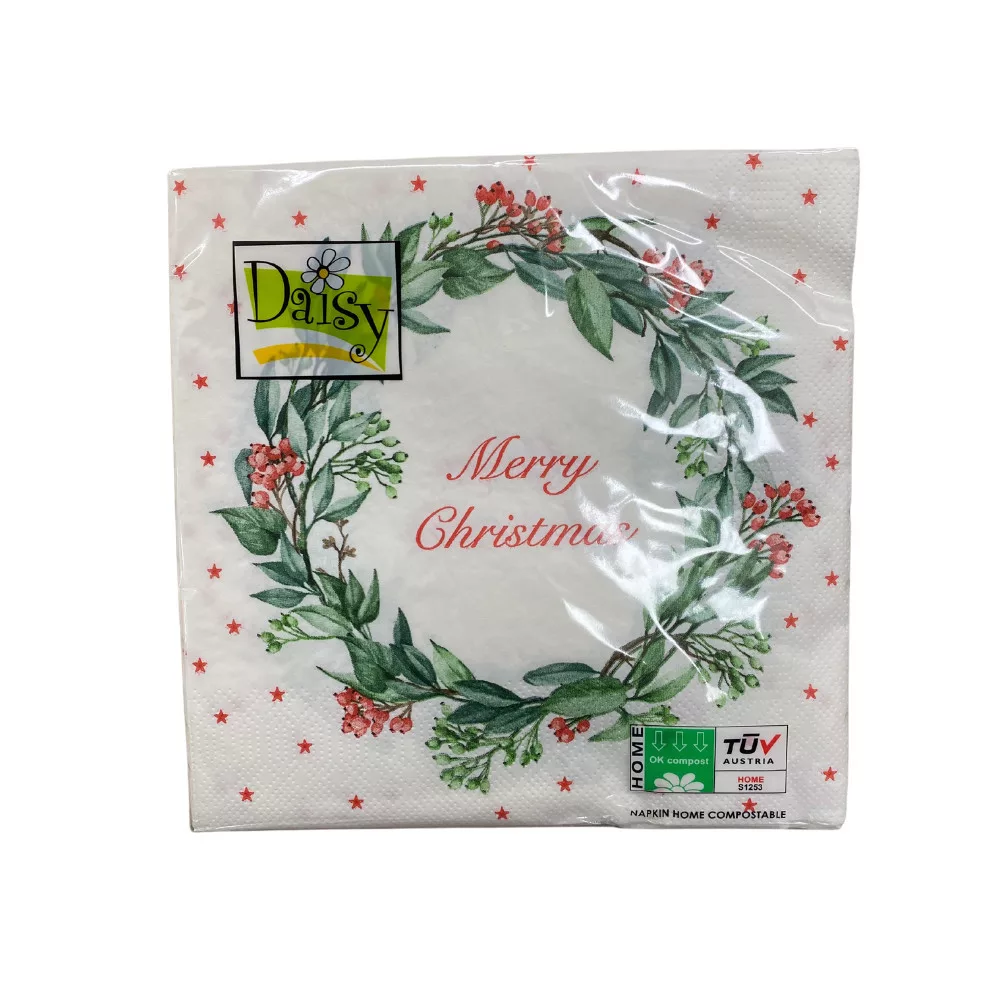 A Daisy karácsonyi szalvéta nem csupán hasznos kelléke az ünnepi asztalnak, de dekorációs elemként is megállja a helyét. A fehér alapon megjelenő zöld koszorú az ünnepi hangulatot idézi meg, míg a 3 rétegű kivitel biztosítja a szalvéta tartósságát és szilárdságát.