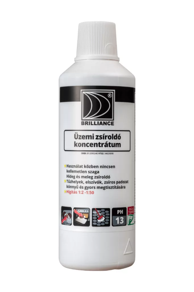 A többször, erősen odaégett szennyeződések eltávolítására fejlesztettük ki a Brilliance® Üzemi zsíroldó koncentrátumot, amely tűzhelyek, kemencék, füstölők megtisztítására alkalmazható az élelmiszeriparban és a vendéglátóiparban. Erősen habzó komponensekkel készült azért, hogy könnyen habosítható legyen a jobb hatásfok érdekében. Így a tisztítószer nem folyik le a felületről és kivárhatjuk az ideális hatásidőt, ami a termék megfelelő hígítása mellett a másik nagyon fontos szempont. Nem alkalmazható alumíniumra, horganyra, illetve olyan festett felületekre, amelyek nem ellenállóak az erős lúgokkal szemben vagy nem a festék eltávolítása a cél.