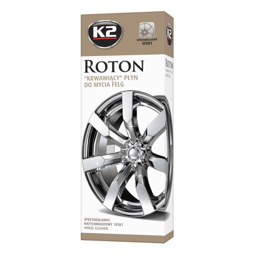 A napfényben csillogó tiszta kerekek tökéletes kiegészítői az autónak. Ez az általunk kifejlesztett igen hatékony tisztítószer minden típusú felnihez (acél, alumínium, króm és festett) biztonságosan használható. A K2 Roton látványosan eltávolítja a makacs szennyeződéseket, beleértve a fékbetétek és a földutak porát, melyektől a tisztító folyadék színe vörösre változik. A kerekek tisztítása ezzel a folyadékkal gyors, hatékony és eredményes, miközben nem igényel különös erőfeszítést. A szennyeződést eltávolítja a felületről annak dörzsölése nélkül.