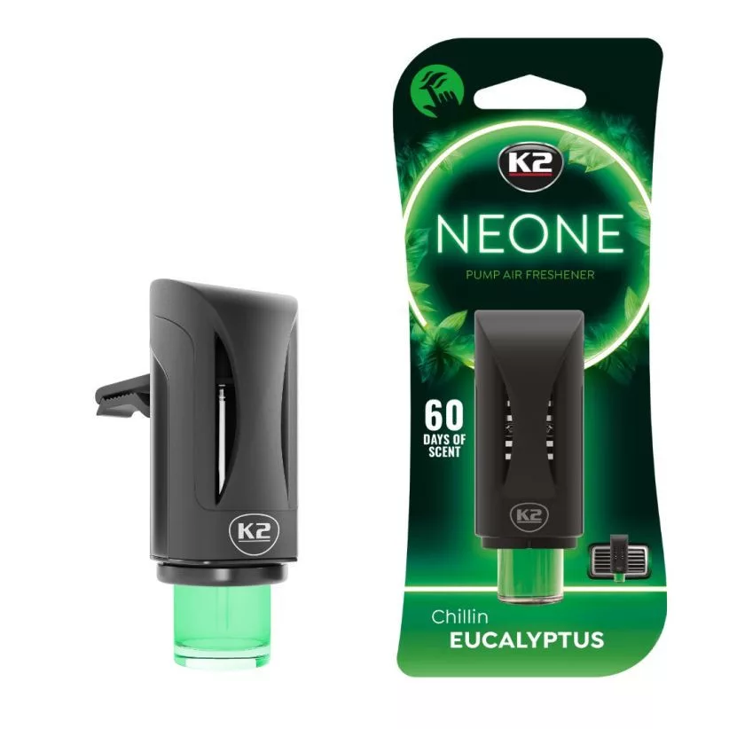 Ismerje meg a K2 NEONE-t - az illat intenzitásának beállításával rendelkező autós légfrissítőt, amellyel tökéletes hangulatot teremthet autója belsejében. A K2 NEONE kivételes, akár 60 napig tartó tartósságot kínál, és minden utazás nélkülözhetetlen társa. Egyedi pumpás kialakításának köszönhetően teljes mértékben Ön irányíthatja az illat intenzitását. Akár gyengéd frissítő jegyre, akár intenzív illatra vágyik, a K2 NEONE lehetővé teszi, hogy az illatélményt az Ön preferenciáinak megfelelően alakítsa ki. Chillin Eucalyptus Az eukaliptusz frissítő illata, amely megkönnyebbülést és nyugalmat hoz bármilyen utazáshoz. A K2 NEONE olyan járművezetők számára készült, akik értékelik a lehetőséget, hogy személyre szabhatják és szabályozhatják autójuk belsejének hangulatát. A K2 NEONE-nak köszönhetően minden utazás egyedi élménnyé válik, tele kedvenc illataival.