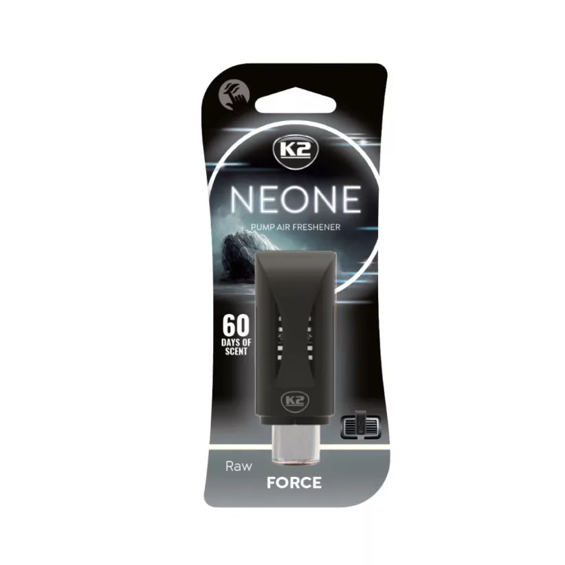 K2 NEONE RAW FORCE állítható intenzitású autóillatosító. A K2 NEONE egy illatosító, amely lehetővé teszi, hogy az autó belsejének hangulatát a hangulatához igazítsa. Praktikus pumpás kialakításának köszönhetően maga szabályozhatja az illat intenzitását – a frissesség enyhe leheletétől az erős, jellegzetes aromáig.  K2 NEONE Raw Force – frissesség és energia a győzelem illatában. A Raw Force az erő és a sportos energia illata. Ötvözi az óceán frissességét és a grapefruit zamatosságát a babérlevél eleganciájával és a fás akkordok mélységével. Patchouli és ámbra egészíti ki, dinamikus, friss és karakteres aromát teremtve. Ez a kompozíció energiát ad, stimulálja az érzékeket és hangsúlyozza az önbizalmat. A K2 NEONE kiemelkedik akár 60 napos tartósságával és modern kialakításával, amely tökéletesen illeszkedik a pilótafülkébe. Az intuitív kezelés kényelmessé és élvezetessé teszi a légfrissítő használatát.