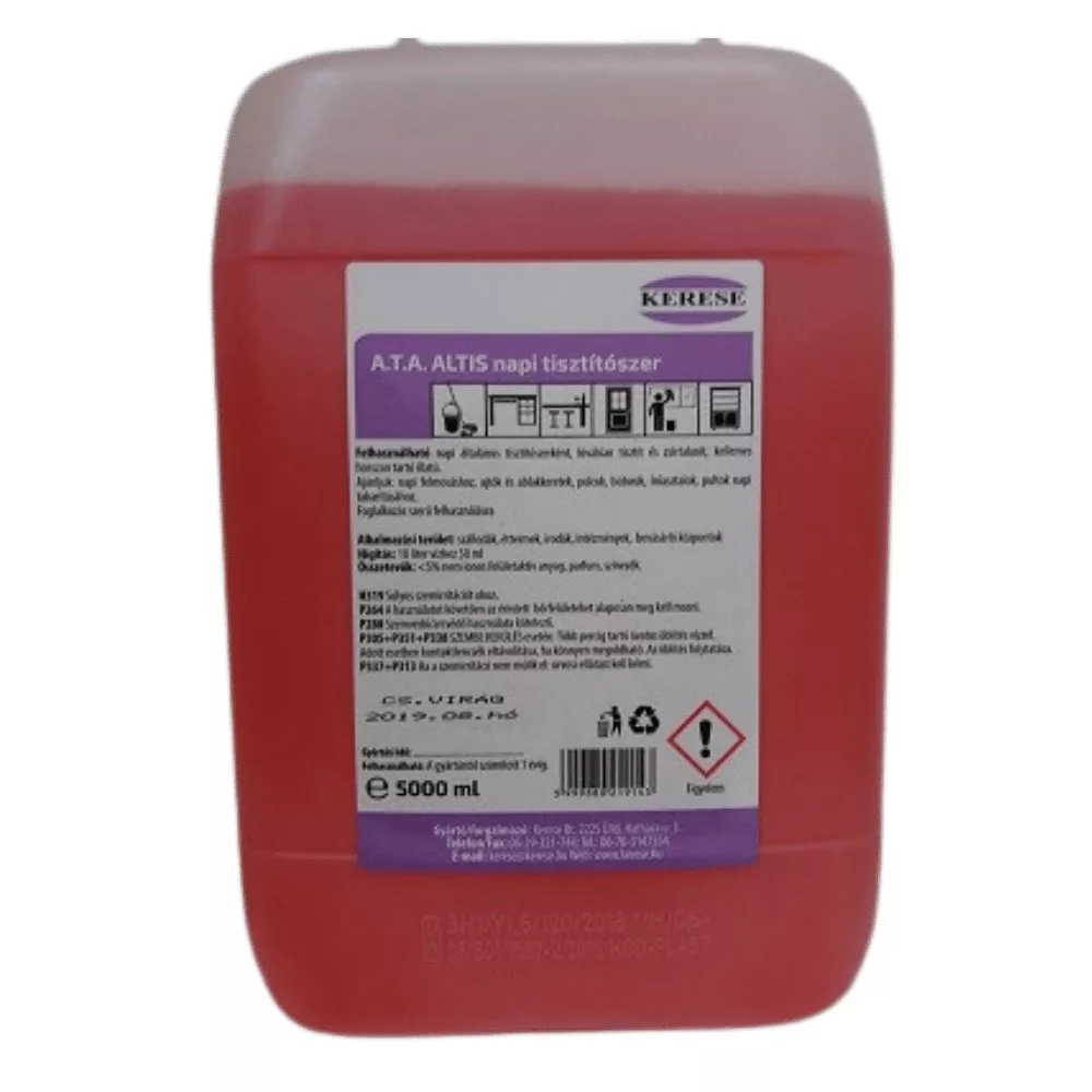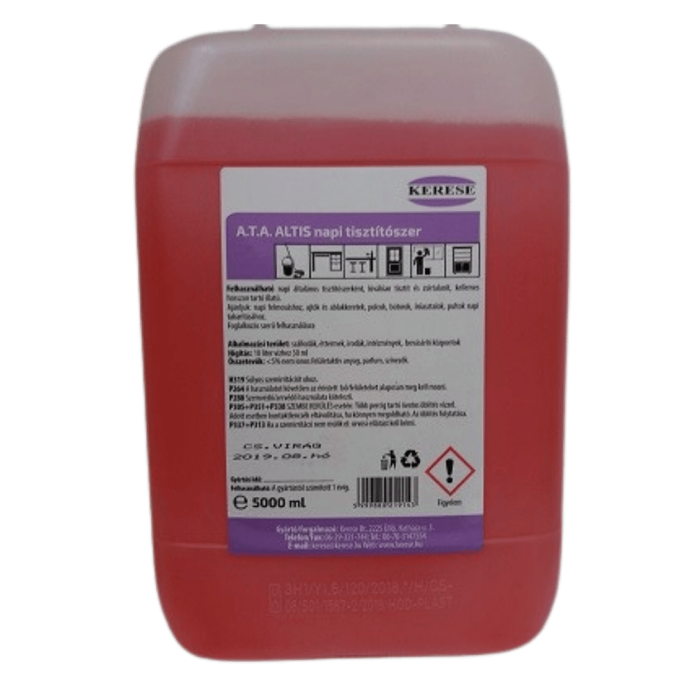 Az A.T.A. Altis egy professzionális felhasználásra tervezett, nagy hatékonyságú általános tisztítószer, amely megkönnyíti a mindennapi takarítást. Speciális formulájának köszönhetően kiváló zsíroldó hatással rendelkezik, így könnyedén elbánik a porral és a makacsabb szennyeződésekkel is. A termék egyik legnagyobb előnye a rendkívül gyors és csíkmentes száradás, ami különösen fontossá teszi a fényes felületek, például üvegek vagy lakkozott bútorok tisztításakor. Nem tartalmaz mattító anyagokat, így megőrzi a felületek eredeti fényét, miközben hosszan tartó frissességet biztosít a helyiségekben. A kellemes cseresznyevirág aroma frissességet varázsol az irodákba, éttermekbe vagy közintézményekbe. Mivel a szer HACCP rendszerbe illeszthető, a vendéglátóiparban is biztonsággal alkalmazható. Gazdaságos, 5 literes kiszerelése és magas koncentrációja révén hosszú ideig elegendő, jelentősen csökkentve a takarítási költségeket. Főbb jellemzők: Sokoldalúság: minden vízálló felületen, például PVC-n, kövön és laminált padlón is hatékony. Csíkmentes száradás: gyorsan elpárolog, így nem hagy foltokat a kényesebb felületeken sem. Zsíroldó erő: hatékonyan távolítja el a mindennapi szennyeződéseket és ujjlenyomatokat. Kellemes illat: intenzív cseresznyevirág aromája hosszan érezhető a takarítás után. HACCP kompatibilis: megfelel az élelmiszerbiztonsági előírásoknak, így konyhákban is használható. Összetevők és fizikai jellemzők Főbb összetevők: Anionos felületaktív anyagok Izopropanol Illatanyag Színezék Víz pH-érték: Koncentrátumban: kb. 7,5 (lúgos közeg) Felhasználási terület és kompatibilitás Az Altis tisztítószert szinte minden vízálló felületen alkalmazhatod a napi takarítás során. Ideális választás irodák, intézmények és vendéglátóhelyek tisztán tartásához. Mázas kerámia és kőburkolatok PVC és linóleum padlók Laminált padló és lakkozott parketta Műanyag felületek, ajtók és pultok Üveg és fém berendezési tárgyak Részletes felhasználási útmutató Az első alkalmazás előtt a szert mindig teszteld le egy kevésbé szembetűnő részen. 1. Napi tisztítás és felmosás: Készíts tisztítóoldatot langyos vagy hideg vízzel. Vigye fel a felületre felmosó moppal vagy törlőkendővel, majd hagyd megszáradni. A gyors száradás miatt utólagos öblítésre vagy törlésre nincs szükség. Hígítási arány: 50 ml tisztítószer 10 liter vízhez (0,5%-os oldat). 2. Erősebb szennyeződések eltávolítása: Makacsabb foltok esetén növeld az adagolást, vagy használd a szert töményebb formában egy szivacs segítségével, majd töröld át a felületet tiszta vízzel. Anyagszükséglet: a felület szennyezettségétől függően változó. A szakszerűtlen alkalmazásért és az abból keletkező károkért a gyártó és a forgalmazó felelősséget nem vállal.
