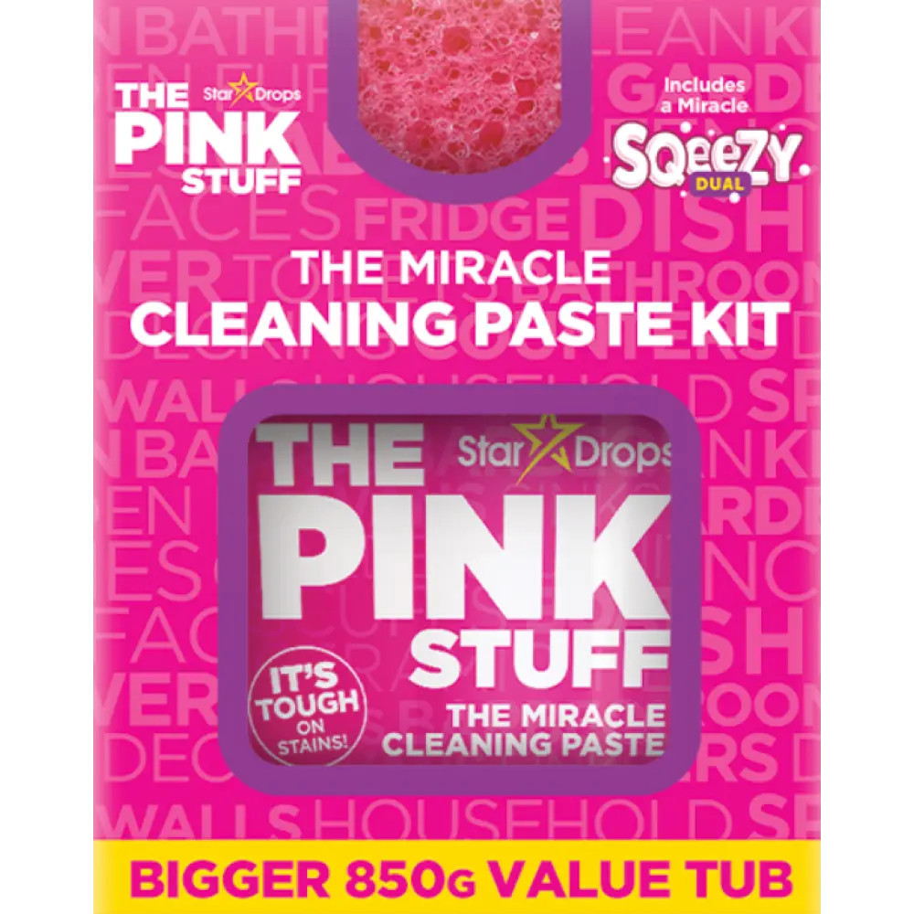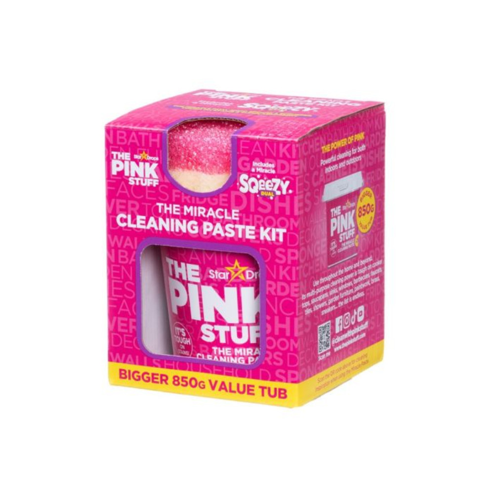A Pink Stuff Miracle tisztítópaszta készlet egy 850g-os Pink Stuff tisztítóoasztát és egy Sqeezy dual, mosogató- és súroló szivacsot szivacsot tartalmaz.