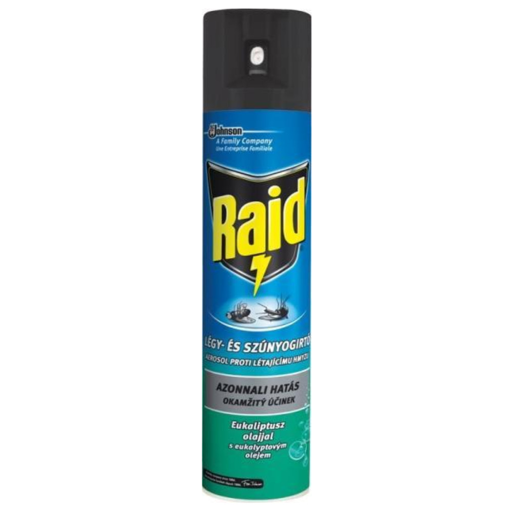 A Raid légy és szúnyogirtó eukaliptusz olajjal a zárt térben rejtett életmódú rovarok (csótányok, ágyi poloska, bolha, hangya, stb.) írtására alkalmas.